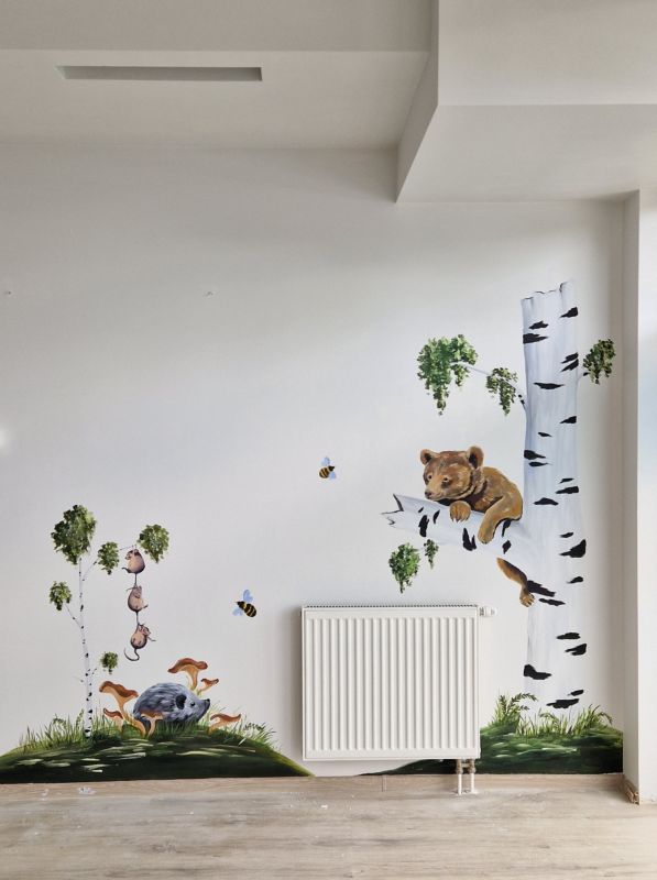 Na jednej ścianie pojawił się słodki króliczek ukrywający się wśród traw, na innej miś wspinający się na drzewo. Można też zobaczyć myszki w trakcie zabawy, sarenki na kwiecistej łące, lisa obserwującego otoczenie, a także jeżyka, żabkę, sowę i motyle. Różnorodność motywów sprawiła, że każda część wnętrza jest ciekawa i przyciąga uwagę dzieci.